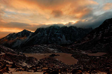 Beautiful landscape silhouette on the mountain peak during sunset with warm sunlight and dramatic sky.