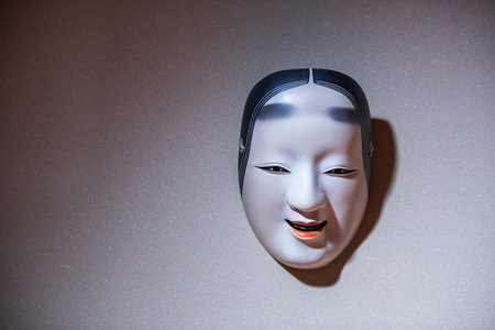 Japanese Vintage NOH MASK, face of young woman, on wall in Tenryo Hina Goten museum in Mamedamachi street, Hita town, Oita, Japan. Edo-period folk culture for hina matsuri doll festival