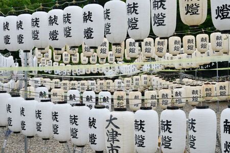 OSAKA, JAPAN - APRIL 3, 2018: Closeup detail of multiple paper lanterns dedicated to the Heavenly King Konpira, a local deity at Hozenji temple. Dotonbori, Namba. Travel and religion.