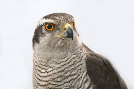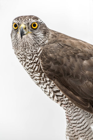 Portrait of a Northern Goshawk (Accipiter gentilis). White background with writing space.