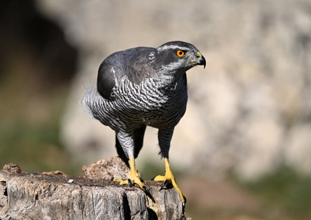 goshawk is sitting on the tree stump, close-up.