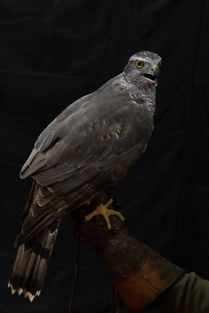 Northern goshawk (Accipiter gentilis) on hand. Eurasian goshawk, bird of prey used in falconry. VIII San Silvestre de Guzman Hunting Fair in September 2019, Huelva, Spain.