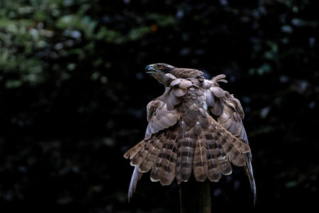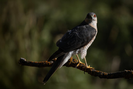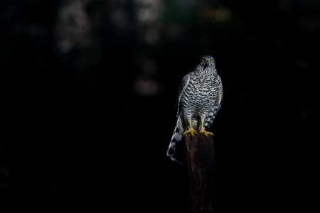Portrait of a Eurasian Sparrow hawk (Accipiter nisus) in the forest of Noord Brabant in the Netherlands. dark background