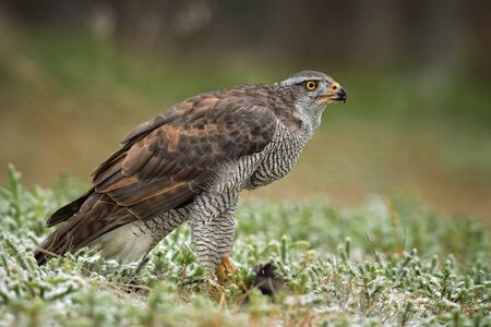 Northern goshawk protecting his food in the forest of Noord Brabant in the Netherlands