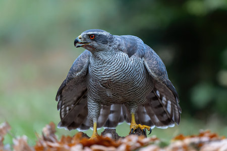 Northern goshawk sitting on ground in forest in autumn