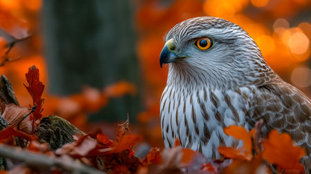 A regal hawk gathers its strength amid fallen leaves and vibrant autumn hues, exuding power and serenity on a quiet forest floor.
