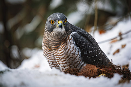 Northern goshawk sitting on snow in winter from side.