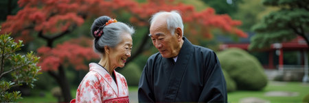 Elderly asian couple smiling together in vibrant japanese garden.