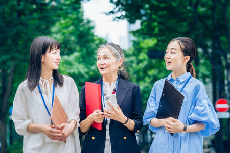 Business women of various ages who bounce vigorously outdoors