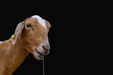 Head of a brown color Jamnapari male goat. This breed of goats originate from Indian subcontinent. Close up shot.