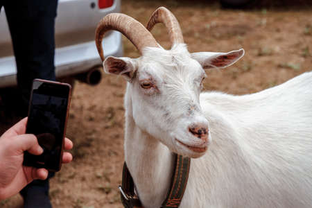 A man takes pictures of a white goat on a smartphone
