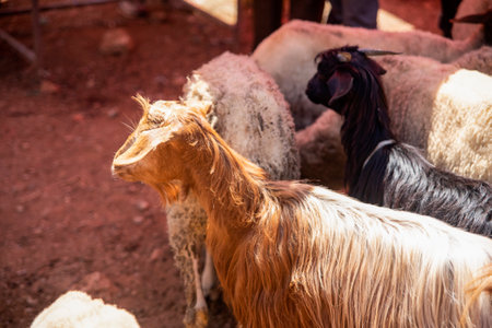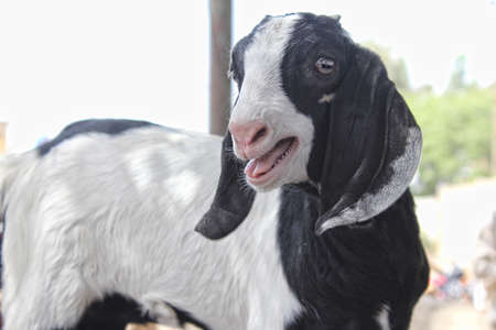 Domestic goat in animal market close up shot