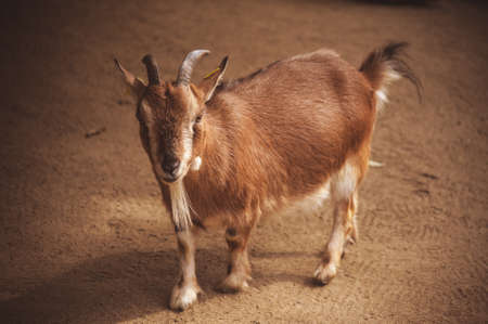 young brown goat in meadow. Goat herd