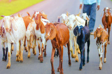 indian man with his goats walking on the road side