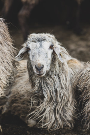 Mountain Carpathian sheep breed. Adult sheep, white with black wool, portrait. Long-haired fleece. Muzzle of sheep.