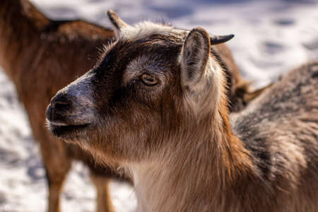 Brown young goat on a snowy background on a farm. close-up.