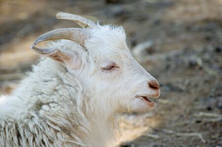 Young cute snow-white goat rests on a summer day in the village. Lamb closeup