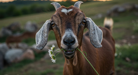 Portrait of goat with daisy flower in the meadow.