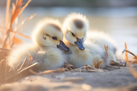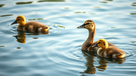Ducks swimming peacefully in a serene lake at sunset, showcasing playful ducklings enjoying the water