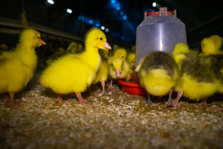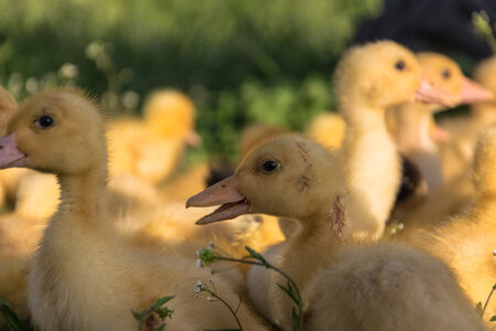 Divorce poultry. A group of young ducklings, teenage chickens in the farmyard pecking food.