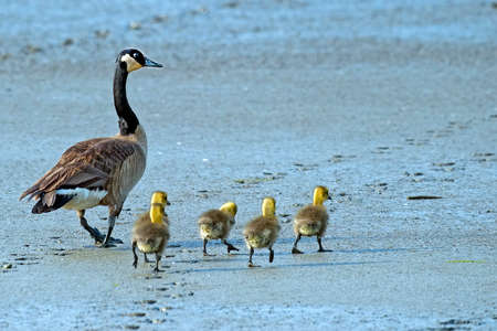 Canada goose (Branta canadensis) parents with goslings that are talking to each other, horizontal