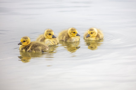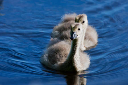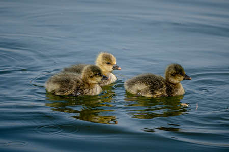 Young Greylag Goose (Anser anser) goslings swimming in the lake