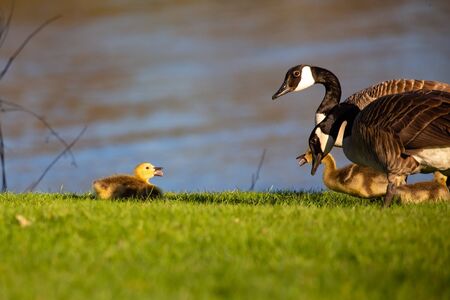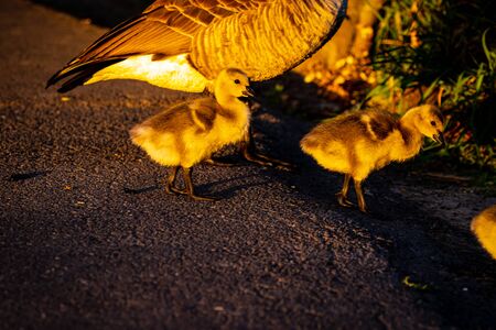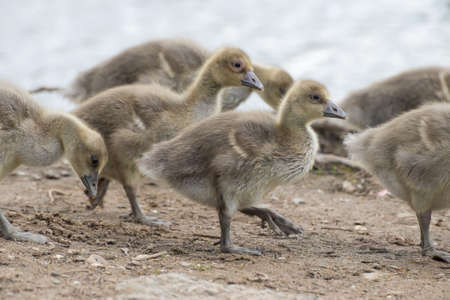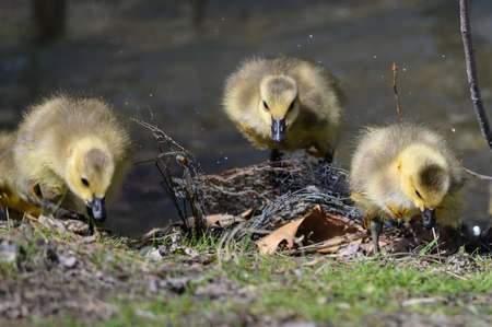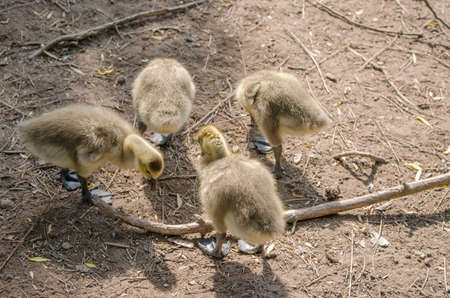 Canada goose (Branta canadensis) goslings in Wausau, Wisconsin eating and looking for foof during the springtime, horizontal