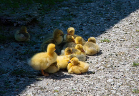 Little ducklings are resting on a green meadow in the sun. A flock of small ducklings chicks lies in the green grass. Farm, poultry farming.