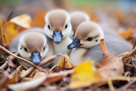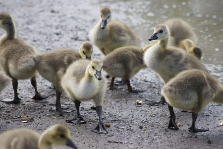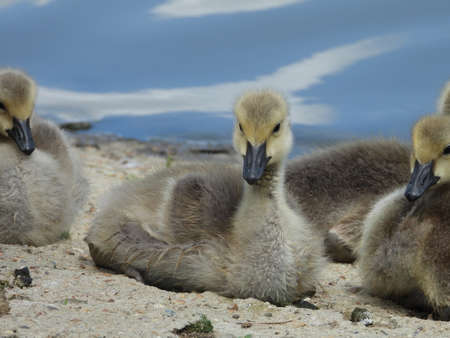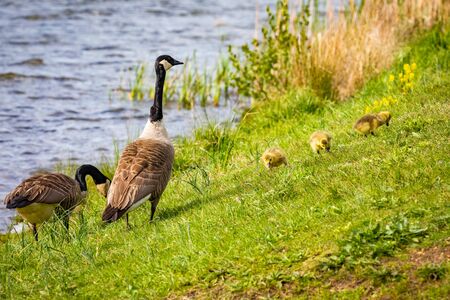 Canada goose (Branta canadensis) goslings at rest next to a lake during the springtime, panoramic