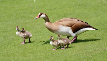 Egyptian goose, alopochen aegyptiacus,and babies walking on the grass near the water