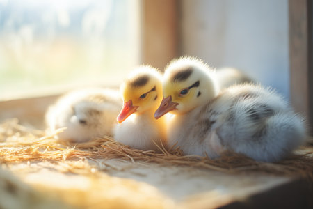 Fluffy yellow chicks explore dry grass on a sunny spring day at a rural farm.