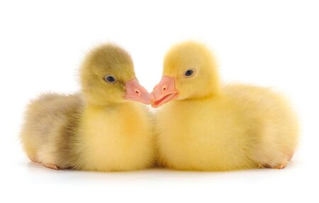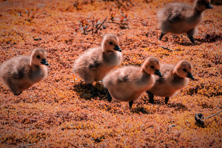 Two Baby Canada Geese, Branta canadensis, or goslings Resting on the ground. High quality photo