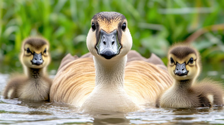 Newborn Goslings Learning to Swim Under the Watchful Eye of Mother