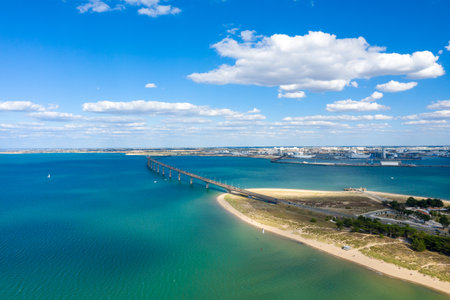 Sweeping aerial view of the Pont de lIle de Re extending across vivid turquoise waters toward the mainland, with sandy shoreline and scattered cumulus clouds overhead. The image highlights the open seascape and tranquil coastal atmosphere of Charente-Maritime in western France.