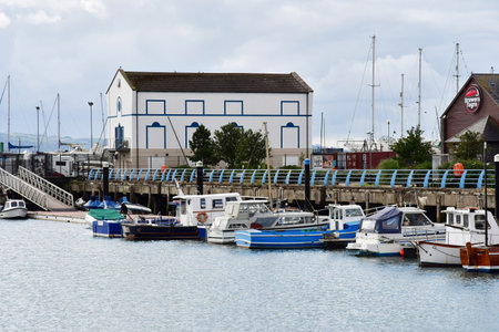 Cardiff, Wales - August 14, 2022: Boats moored at modern marina in Cardiff Bay with waterfront restaurants and people relaxing on a sunny summer day