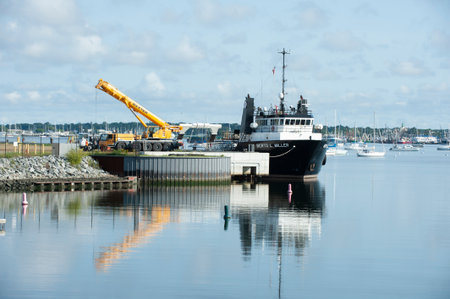 New Bedford, Massachusetts, USA - September 10, 2019: Reflections of crane and offshore supply vessel Berto L. Miller docked at Marine Commerce Terminal in New Bedford