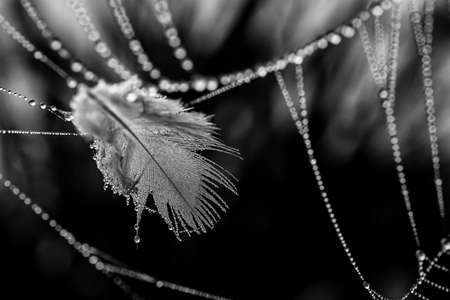 beautiful little delicate water drops on a spider web in close-up on a foggy day