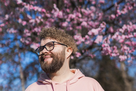 Man allergic enjoying after treatment from seasonal allergy at spring. Portrait of happy bearded man smiling in front of blossom tree at springtime. Spring blooming and allergy concept. Copy space