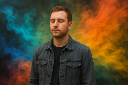 Young man meditating with closed eyes and colorful smoke in the background, creating a vibrant and surreal atmosphere