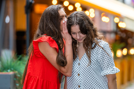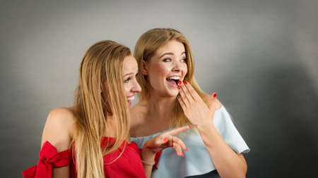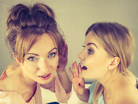 Two female friends telling tales gossiping about somebody having fun. Social human relations concept.