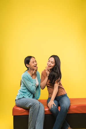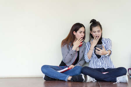 Teenagers women gossip girlfriend sharing secrets smiling sitting talking surprise in the ear and looking smartphone online news, copy space background