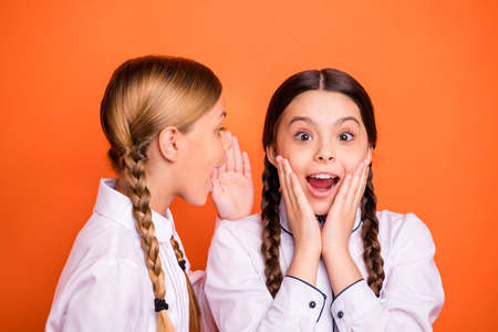 Close-up portrait of nice attractive lovely winsome charming sweet cheerful cheery positive pre-teen girls amazed stunned wondered sharing news isolated over bright vivid shine orange background