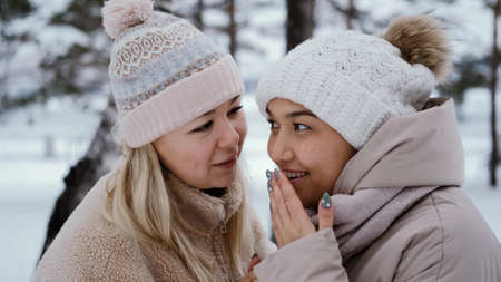 Cheerful women sharing secrets, gossiping, having fun together outdoors in winter.
