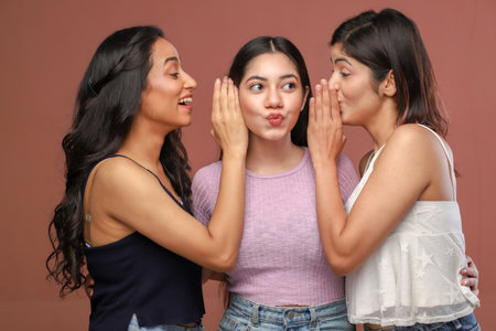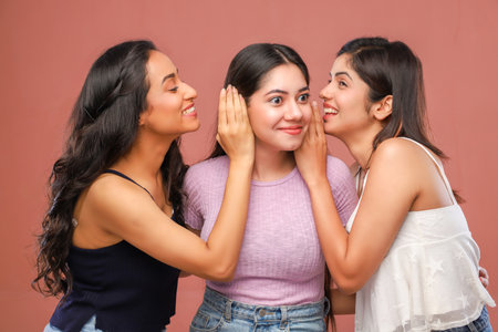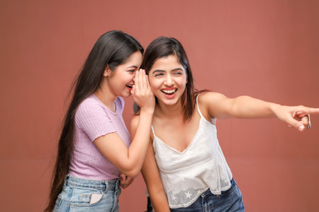 Two close friends engaging in playful gossip and sharing secrets while joyfully laughing and whispering together in a lighthearted moment of connection and camaraderie that showcases their friendship