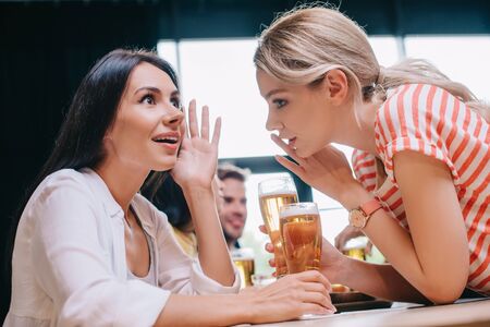 Young woman telling her friend some secrets, two women talking gossiping. Excited emotional girl whispering to ear