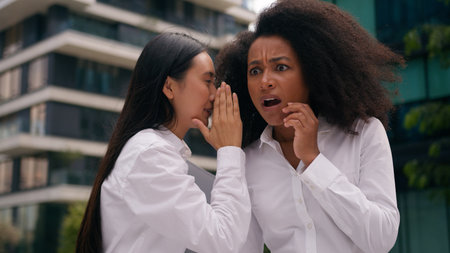 Two women African American Asian Korean girls whisper on ear secret shocked amazing news colleagues co-workers friends gossip talking businesswomen business open mouth gossiping chatting city outside
