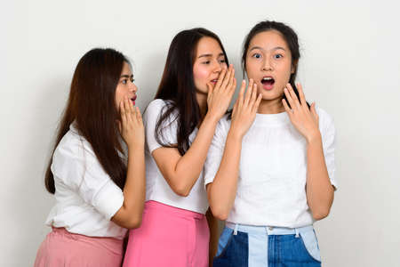 It is unbelievable! Close-up of two beautiful young women gossiping while standing isolated on white