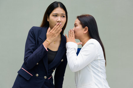 Two Asian woman gossip revealing secret to her friend in office. People communication and friendship concept