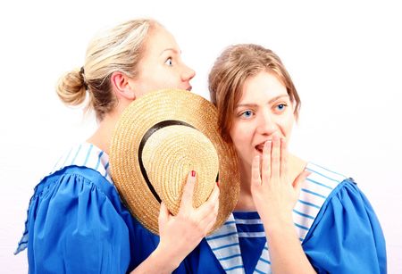 beautiful blond sisters in classic blue swim wear who are sisters whispering a shocking secret to one another behind a straw thatched hat