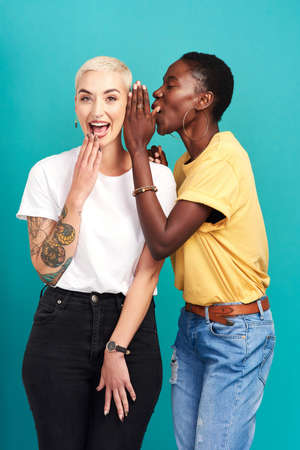 For your ears only. Studio shot of a young woman whispering in her friends ear against a turquoise background.